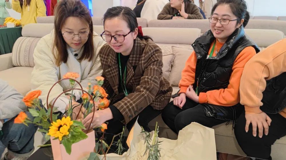 一枝枝小雛菊、向日葵等經(jīng)過女同胞們的巧手修枝剪葉,巧妙的創(chuàng)意組合,勾勒出一籃籃錯落有致、色彩鮮艷的插花作品,寄托著女同胞們對美的理解和對幸福的感悟。